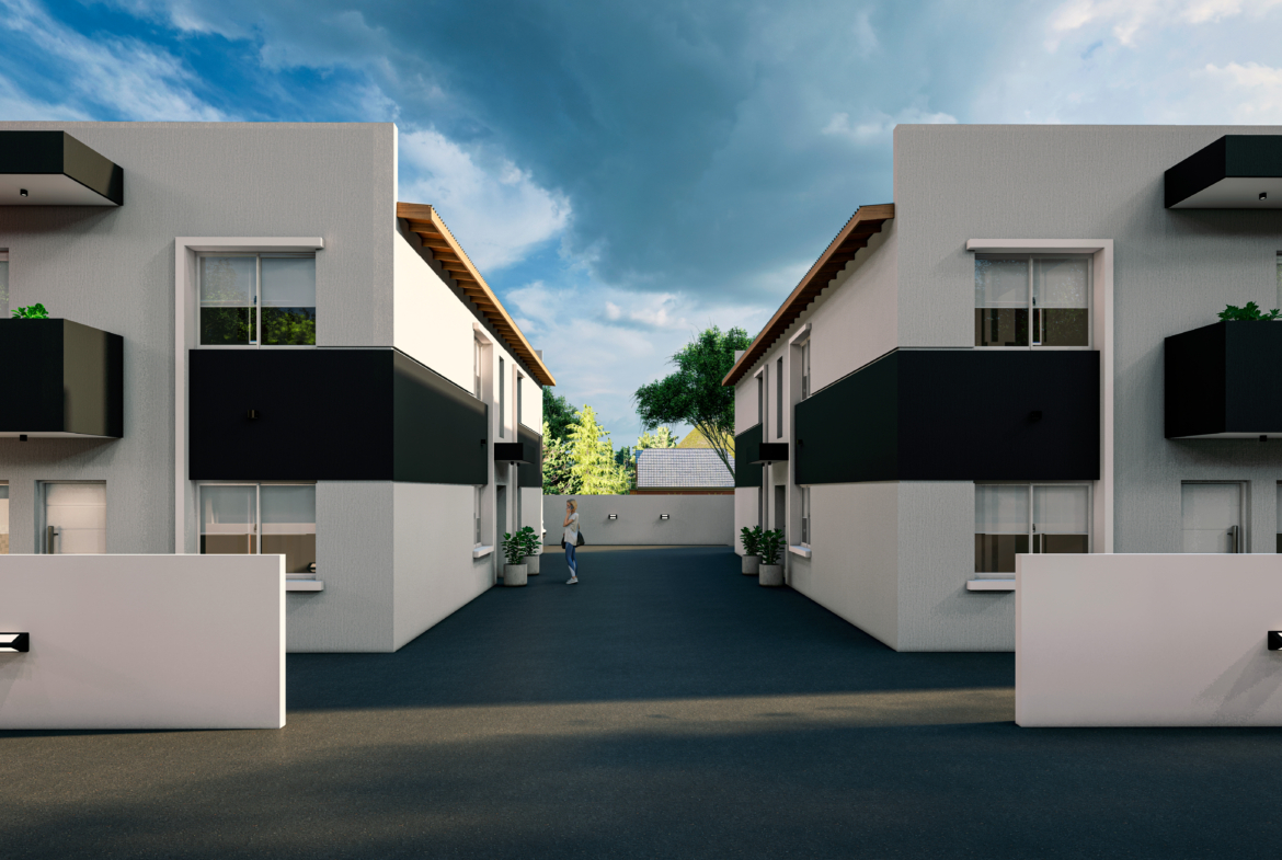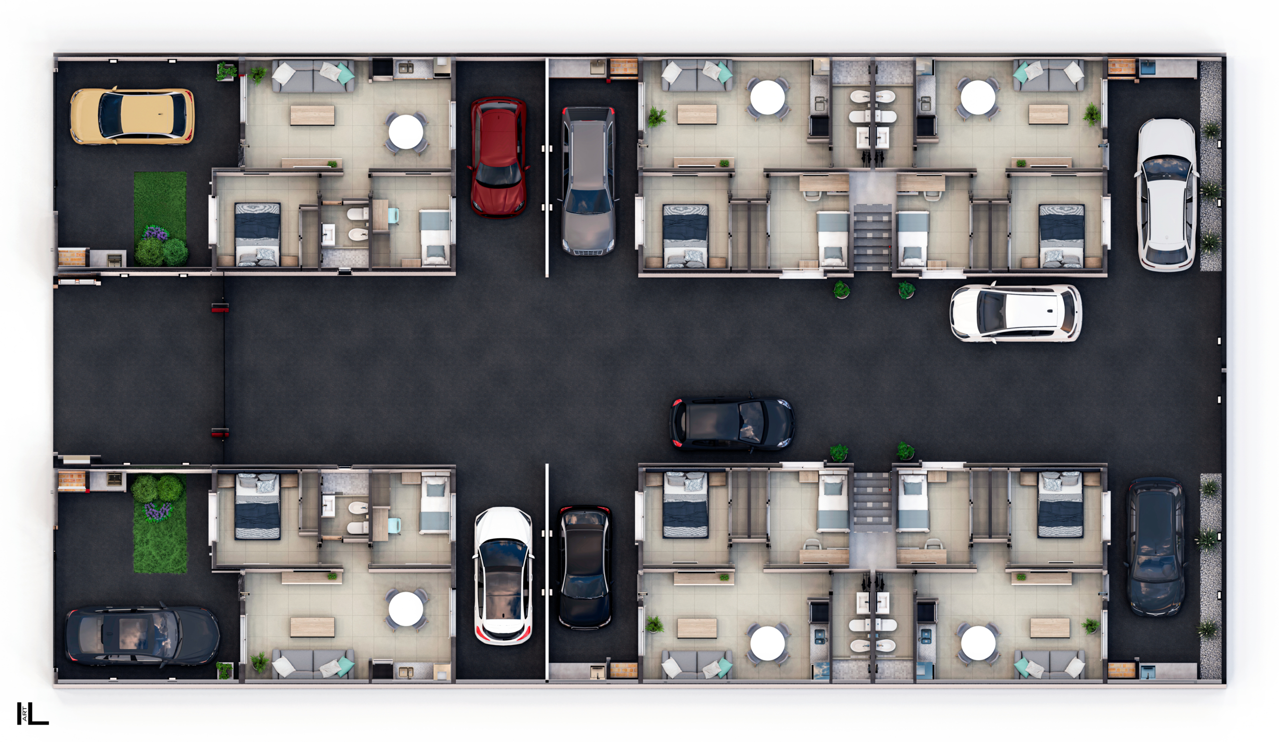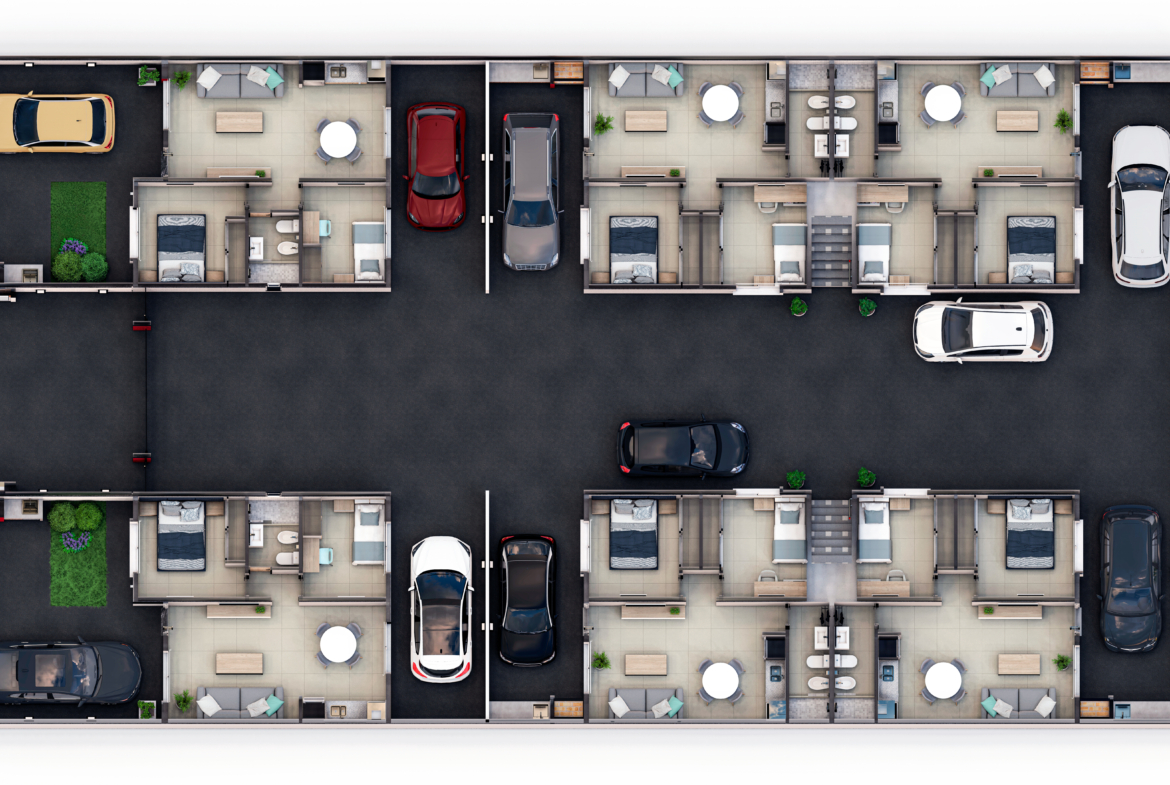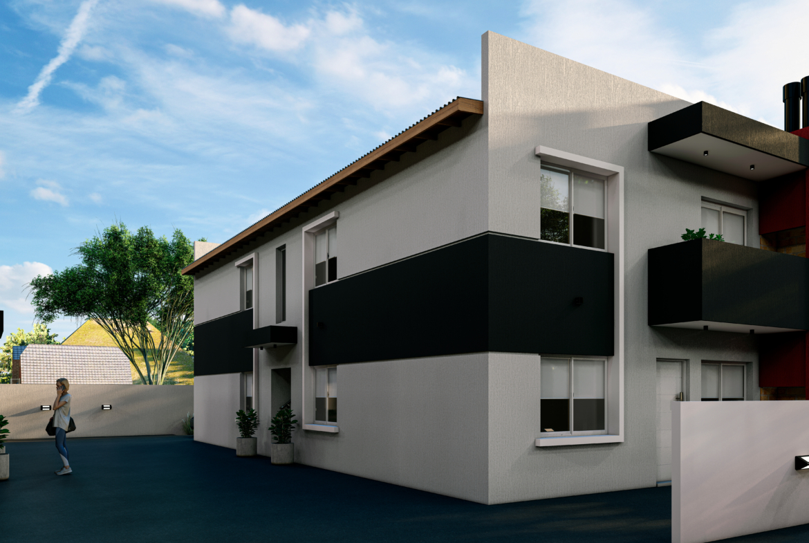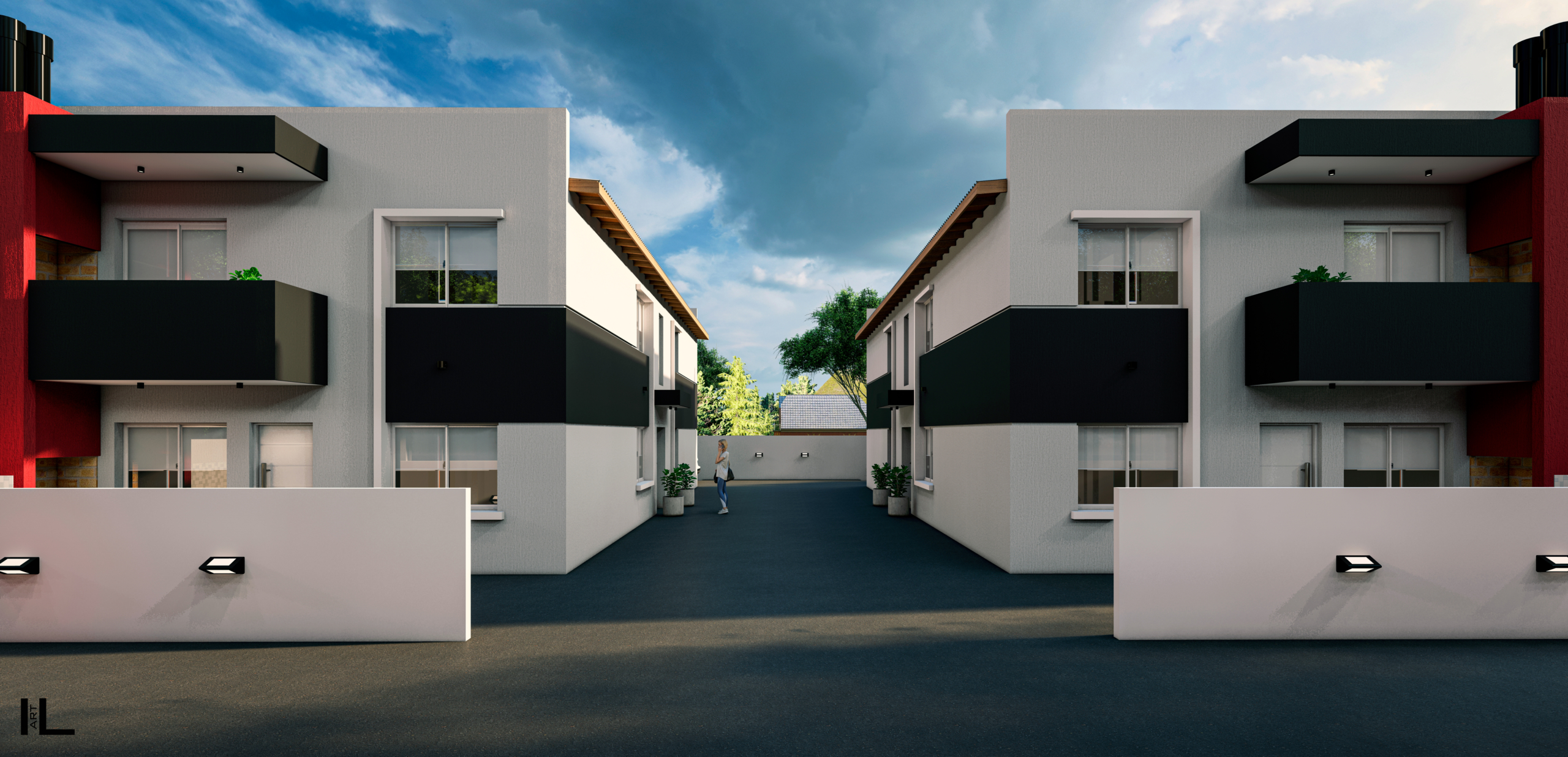 Todas las unidades están compuestas por living, cocina-comedor, baño completo y dos dormitorios. Las unidades de planta baja tienen su propia cochera-patio con parrilla, lavadero y espacio para lavarropas. Las unidades del primer piso tienen su espacio vehicular asignado en el complejo y su parrilla, pileta-lavadero y espacio para lavarropas ubicados en el balcón.